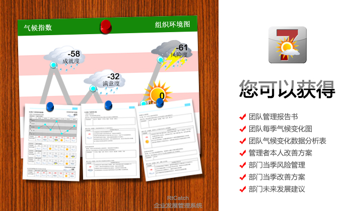 运用科学数据及组织气象图,使管理者快速掌握部门环境,并用适当方案调节温度,例如当快要下雨时我们必须准备雨具防患未然,当团队心情低落时我们必须用方案解决此问题,使部门回归正常的艳阳天,部门整体的表现深受氛围影响,管理者必须对各种维度进行恒温控制,问题是部门需要多少温度及目前又处在何种温度?当你发现管理者还在凭借感觉或经验管理部门时,部门管理是有高度风险的,别让部门成为冰冷的世界,激发员工士气需要有好的平台,RtCatch是管理者必备的仪器。